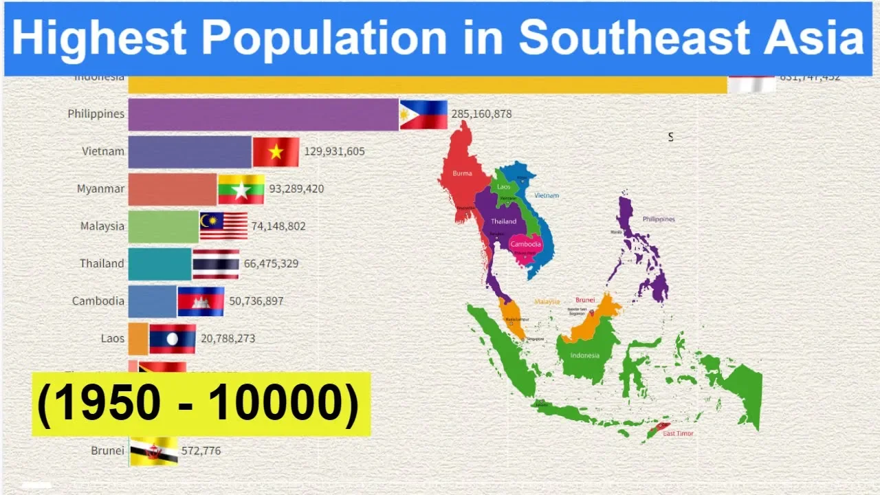 Watch this video to find out what Southeast Asia's population will be from 1950 to 10000 AD. Find out how many people will live in Southeast Asia, what countries will be the most populous, and more.<br /><br />Thanks for watching!<br /><br />According to the United Nations, the world's population is projected to reach 11.2 billion by the end of the 21st century. In this video, we take a look at what is happening in Southeast Asia and how the population is projected to grow in the next few decades,centenary.As you can see in this Southeast Asia Population 10000 A.D. in video. This video provides a detailed look at the growth happening in Southeast Asia and how it is projected to affect the world as a whole.What will be the population of Southeast Asia in 10000 AD? This and other interesting questions are answered in this video.In this video, we explore the topic of Southeast Asia's population in 2023. By the end of the video, you'll be able to answer the question, "What will be the population of Southeast Asia in the Future 1950,1960,1970,1980,1991,2000,2011,2020,2021,2022,2023,2024,2025,2030,2035,2050,2100,2150,2200,2250,2300,2400,2500,2600,2700,2800,2900,3000,3500,4000,4500,5000,6000,7000,8000,10000?<br /><br />I tried to do everything to make it interesting, accurate, watch the video to the end, tell me from which country you watched this video, found your country here. I want you to enjoy it.The primary topic of my channel will be statistics related to the economy<br /><br />***Number 0 - no data for this Country<br />***This data is the UN version of constant fertility<br /><br />*Support channel development in my paypal -