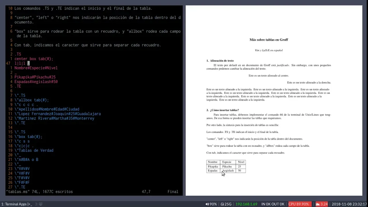 Alineación de texto y más sobre como insertar tablas en Groff