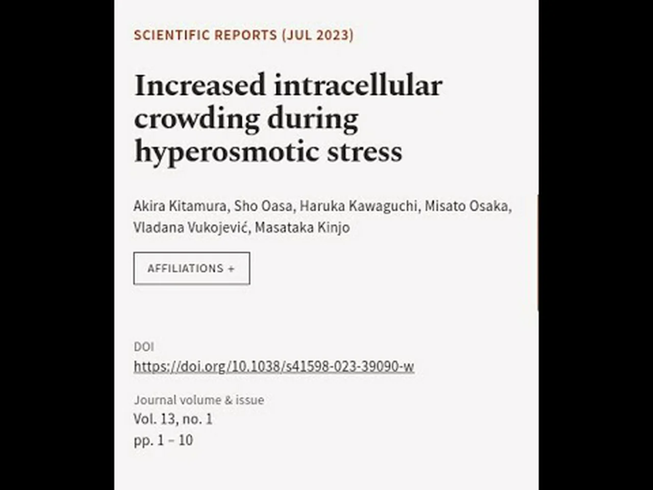 ### Keywords ###<br />#AbstractHyperosmotic #Hyperosmoticstress #cellenvironment #macromolecularcrowding #MMC #increasedintracellular #intracellularmacromolecular #RTCLTV #shorts<br /><br />### Article Attribution ###<br />Title: Increased intracellular crowding during hyperosmotic stress<br />Authors: Akira Kitamura, Sho Oasa, Haruka Kawaguchi, Misato Osaka, Vladana Vukojević ,and Masataka Kinjo<br />Publisher: Nature Portfolio<br />DOI: 10.1038/s41598-023-39090-w<br />DOAJ URL: <a href="https://doaj.org/article/acbc67dcac7f41869755d87bd19c3a41" target="_blank" rel="nofollow">https://doaj.org/article/acbc67dcac7f41869755d87bd19c3a41</a><br />Source URL: <a href="https://doi.org/10.1038/s41598-023-39090-w" target="_blank" rel="nofollow">https://doi.org/10.1038/s41598-023-39090-w</a><br /><br /><br /><br />### Image Attribution ###<br />We used stable diffusion to programmatically generate the background images. <br />Viewer discretion is advised.<br /><br />### Channels ###<br />YouTube Channel: <a href="https://www.youtube.com/@medicinertcltv" target="_blank" rel="nofollow">https://www.youtube.com/@medicinertcltv</a><br />Odysee Channel: <a href="https://odysee.com/@medicine_rtcl_tv" target="_blank" rel="nofollow">https://odysee.com/@medicine_rtcl_tv</a><br /><br />### Video Timestamps ###<br />0:00:00 - Summary <br />0:00:20 - Title <br />0:00:27 - End <br />